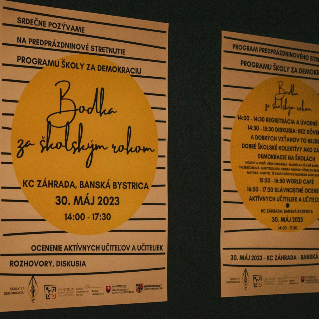 Na konci mája sme mali veľmi radostné a už aj veľmi tradičné predprázdninové stretnutie „Bodka za školským rokom“! Toto slávnostné podujatie na konci školského roka spojilo učiteľov a učiteľky, ako aj náš realizačný tím celoročného vzdelávacieho programu Školy za demokraciu. Je to pre nás dôležitý moment, ako uzavrieť školský rok a osláviť všetky naše úspechy a pekné chvíle ale aj podiskutovať si o dôležitých veciach, ktoré v školách spolu s vami riešime. Vieme, že bez dôvery a dobrých vzťahov to nejde a že dobré školské kolektívy sú základom demokracie na školách.